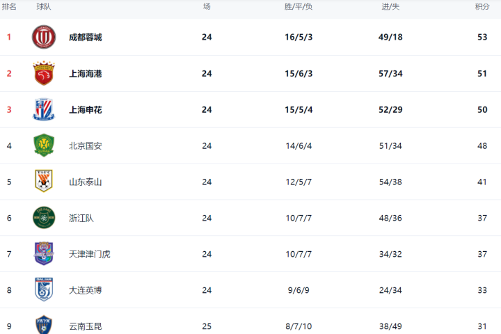 在积分榜上,成都蓉城以53分排名榜首。第2名的是上海海港,拿到了51分。上海申花以50分紧随其后。至于北京国安,就有点掉队了,只拿到48分,排名第4。山东泰山41分排名第5。浙江队和天津津门虎都是37分。大连英博33分,排名第8。云南玉昆31分,排名第9。