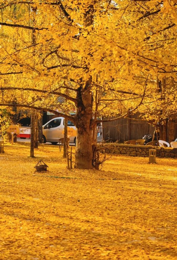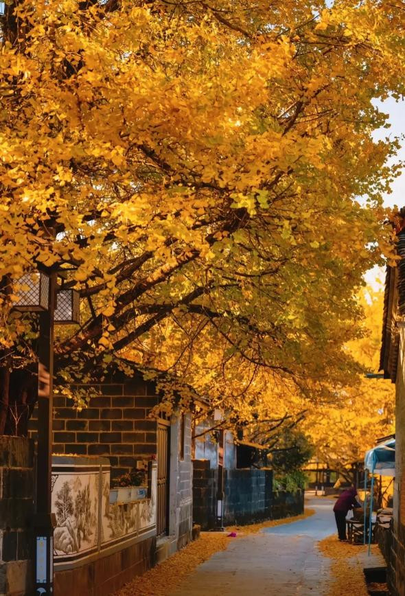 3000多株古银杏,把整个村庄染成金色。阳光从枝叶间落下,村道铺满金黄落叶,炊烟慢慢升起,空气里有晒玉米和辣椒的味道,混着早饭的热气。