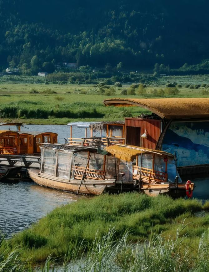 不远处的北海湿地,则是腾冲的另一面。金色水草铺满湖面,竹筏穿行其中,风轻轻吹,带来候鸟迁徙时翅膀扇动的声音。