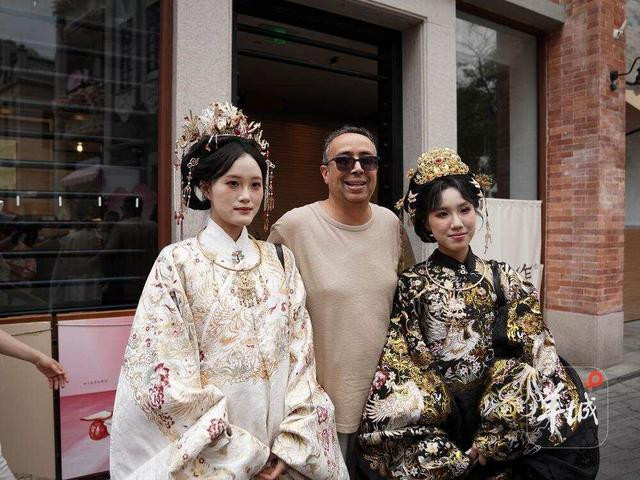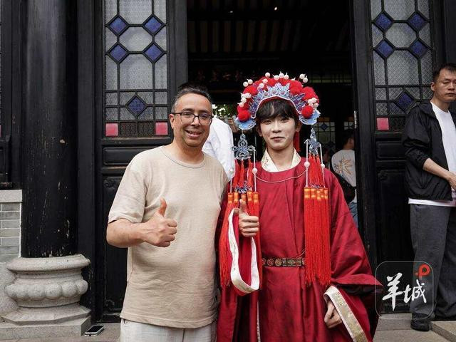 走出博物馆,Karem惊喜地发现永庆坊街头有不少身穿汉服、旗袍的游客正在拍照打卡,古装与骑楼老街相映成趣。他热情地上前交流,与他们合影留念,镜头定格下中西文化碰撞的温馨瞬间。