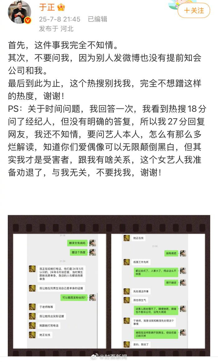 [#于正指责腾泽文不体面#:准备劝退了]#于正准备劝退腾泽文#7月8日晚,@于正发文回应旗下艺人@滕泽文kk与@田栩宁_的绯闻,表示自己完全不知情,晒出的聊天记录中曝出田栩宁、滕泽文于2024年5月认识,6月恋爱,当时男方对女方宣称自己是单身,女方正在找男方当时自称单身的证据,于正回应“都过去式了,人家火了,何必这么不体面”,并表示自己才是受害者,准备劝退滕泽文。据悉,滕泽文是大热短剧《我在80年代当后妈》女主。#田栩宁滕泽文#