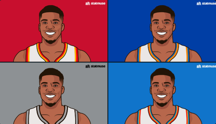 StatMuse晒出字母哥身穿四支球队的球衣照:分别是老鹰、马刺、尼克斯和雷霆。