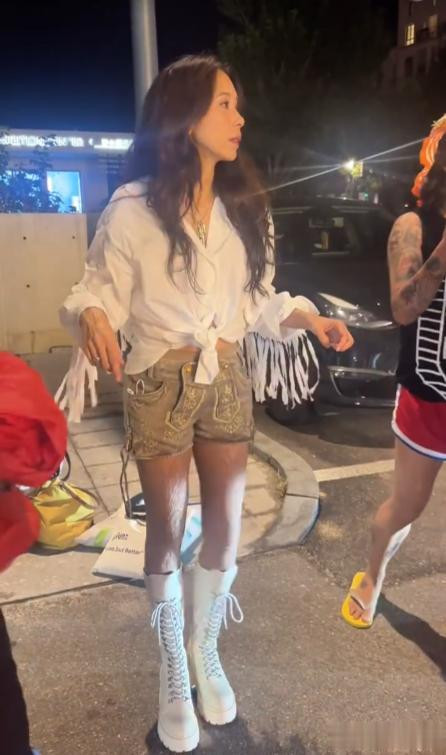 当天,她身穿一件白色衬衫,胳膊上缀满了流苏,下面搭配了一条短裤和长靴,身材看起来非常苗条,瘦瘦高高的。