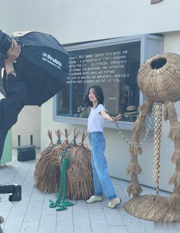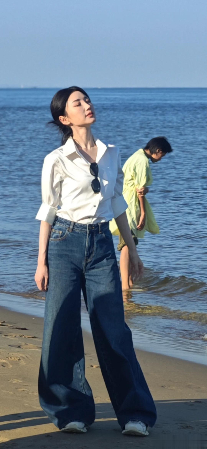 首先就是演员毛晓彤,当天,她身穿白色衬衫、牛仔裤,打扮的非常简约时尚,她站在海边,对着镜头不断的调整姿势,看起来瘦瘦小小的。