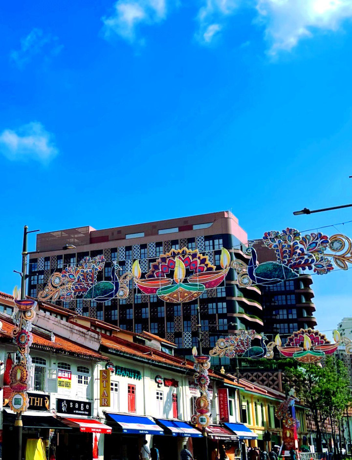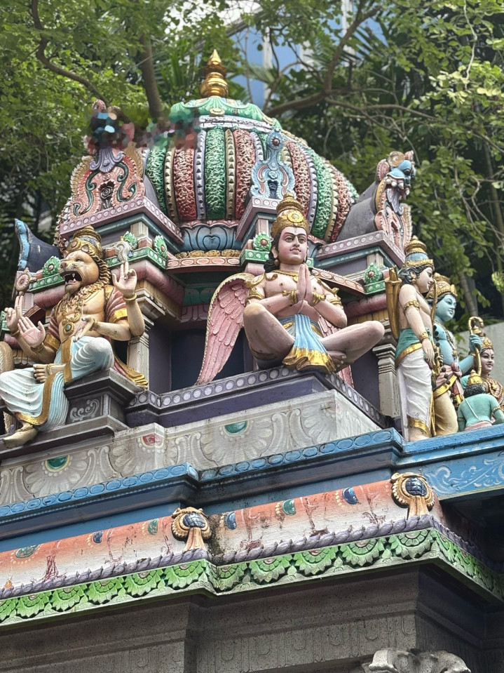 走进小印度,像闯进了打翻的颜料盘:橙色的纱丽店门口挂着成排的布料,风吹过时像波浪般翻动,纱丽上的金线在阳光下闪着光;黄色的花店摆满金盏菊和茉莉花,花串挂在门口,香气浓得化不开,摊主笑着递来一小串茉莉花,戴在手腕上,香气能跟着走一路;红色的维拉马卡里拉曼庙外墙绘着印度教神祇,蓝色的眼睛、金色的头饰,生动得像要从墙上走下来。