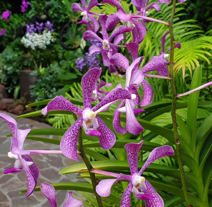 兰花园是园里的宝藏。不像北京植物园的兰花规规矩矩地摆在花架上,这里的兰花像野生般挂在树干上、垂在藤蔓间:白色的蝴蝶兰像振翅的蝴蝶停在枝头,紫色的石斛兰像小铃铛般串成一串,最惊艳的是一种绿色的“幽灵兰”,花瓣薄得像宣纸,透着光,仿佛一碰就会碎。