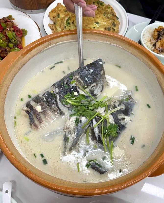 走进当地馆子,肥肠火辣,炒鸡够锅气,鱼头汤鲜嫩,是湖里当天打捞的。