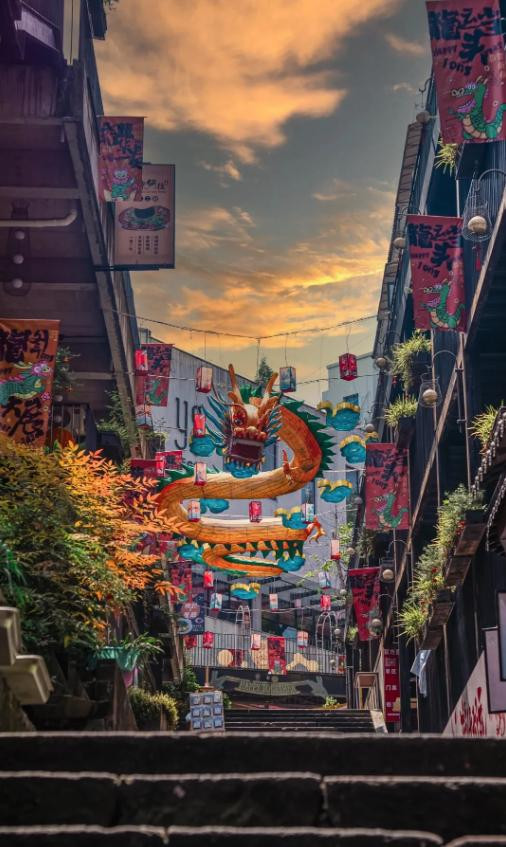 晚上去骑龙巷,122级台阶从湖岸连到山腰,青石路配着老宅灯光,游客不多,但氛围感拉满。街边有小酒馆,也有卖杂鱼烧烤的摊位,正好当夜宵。