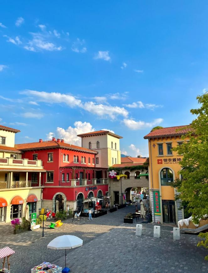转个弯就是啤酒小镇。欧式外立面整齐排布,红砖、尖顶、绿窗,配上湖边景色,有点像误入了欧洲小镇。黄昏时分灯光亮起,安静但不冷清。