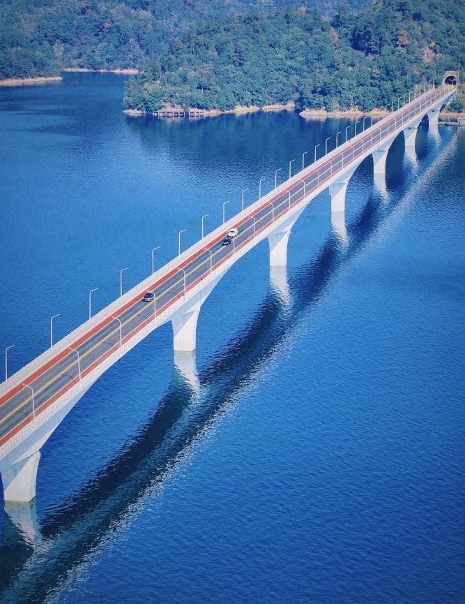 返程途中顺带路过千岛湖大桥,桥身宽阔平直,远景里桥与岛嵌在一起,像素画一般。